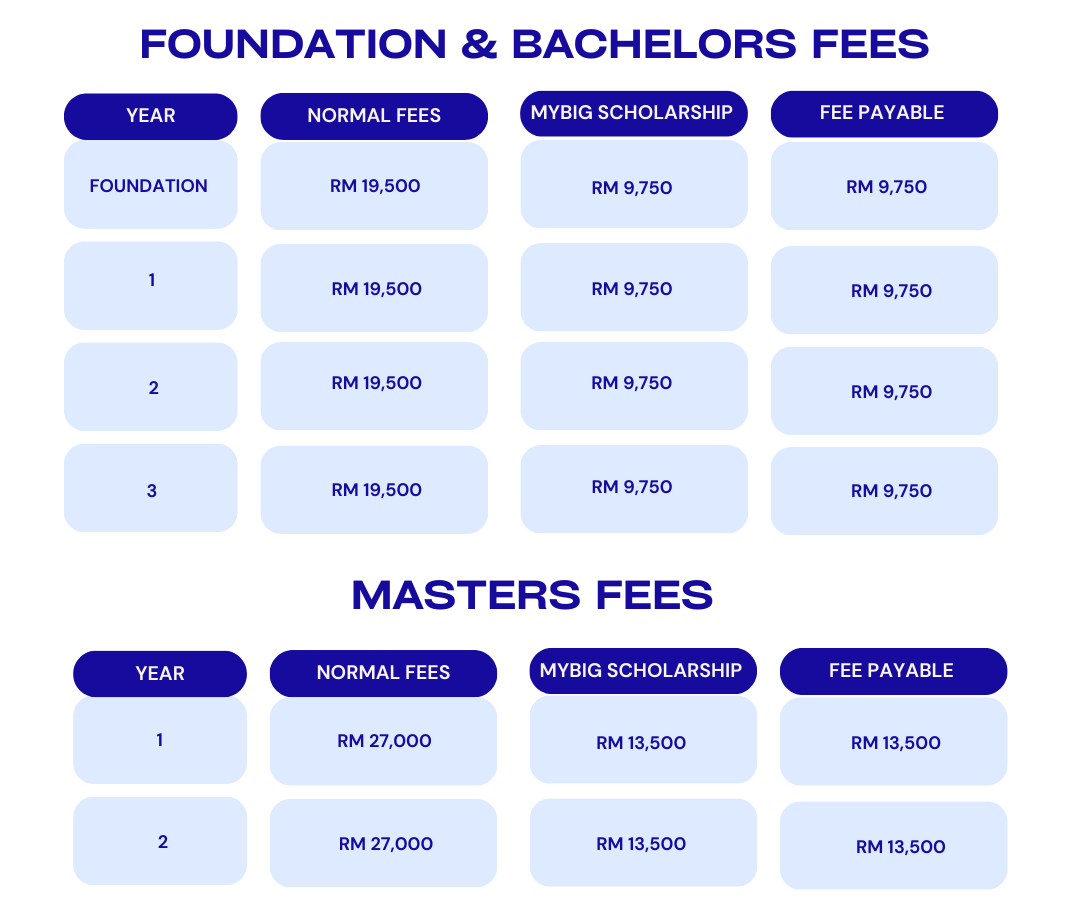 All students will be required to pay annually the Registration Fees of RM600 and Library fees of RM200 per year. The tuition fees before and after MyBIG (All fees stated below are exclusive of the 6% SST Tax) is as follows:
