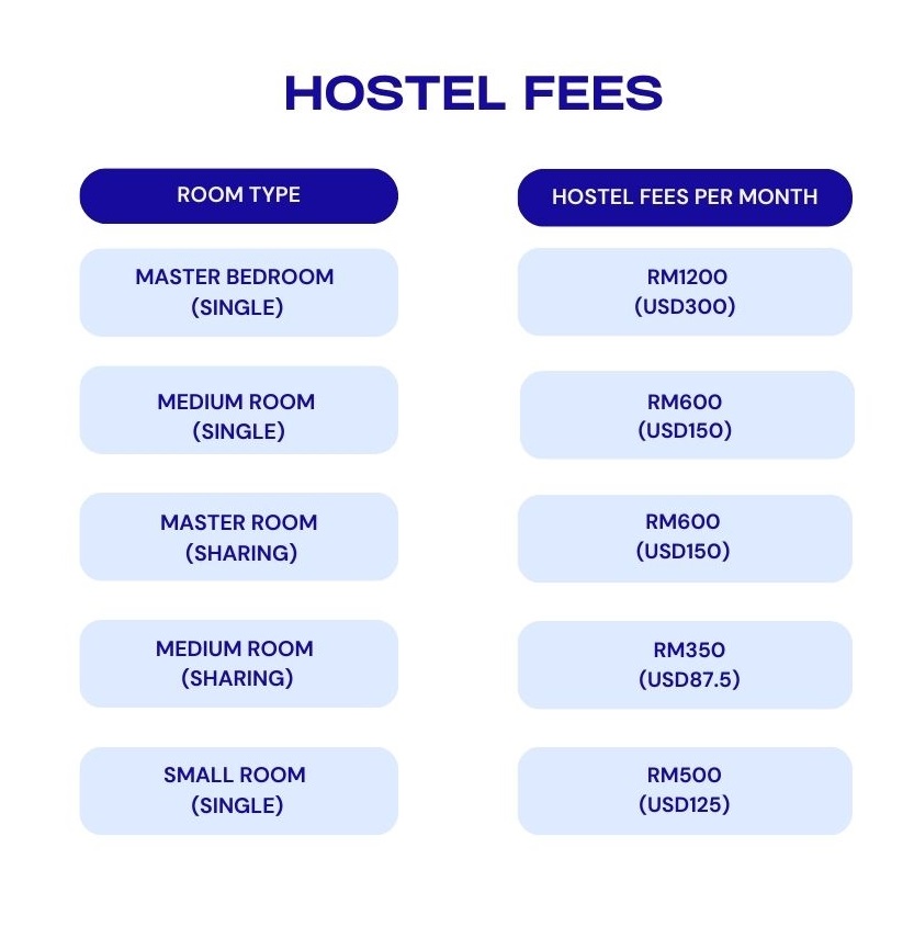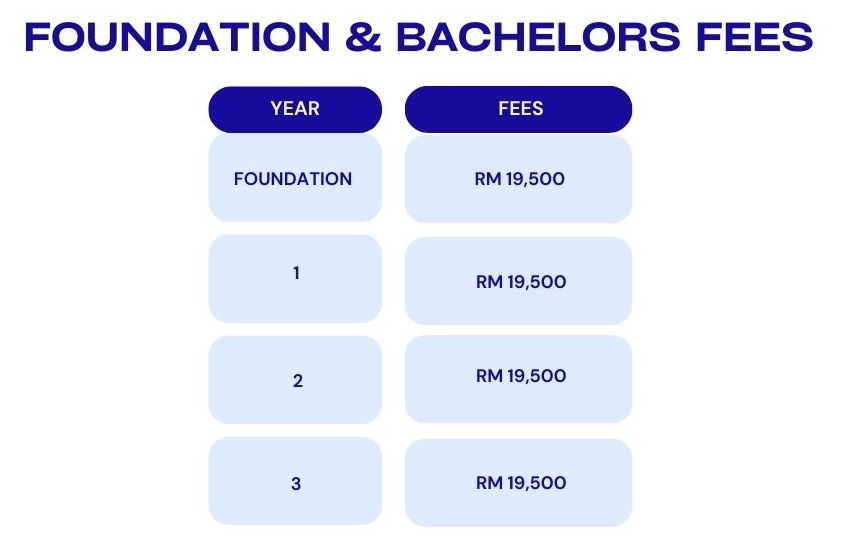 All students will be required to pay annually the Registration Fees of RM600 and Library fees of RM200 per year. The tuition fees are shown in the table below. (All fees stated below are excludes the 6% SST Tax)