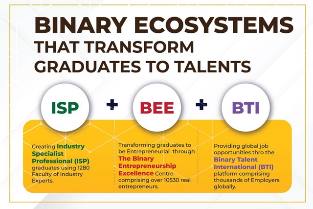 Quality education alone is not suffice to secure good paying jobs in today’s highly competitive job market. That is why at Binary we have a unique system of creating highly employable graduates through our Ecosystem Based Education Model. Using this model, you will be transformed to be an Industry Specialist Professional under our ISP Ecosystem, be equipped with an entrepreneurial mindset so that you can be creative and innovative using our BEE ecosystem and connect you to the thousands of Employers who are part of our BTI Ecosystem and seeking Industry Specialist Talents.